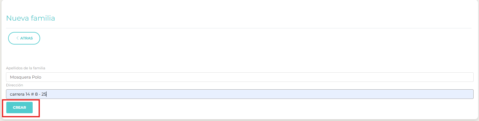 2. Diligencie los apellidos y la dirección de vivienda de la familia, y click en el botón crear: