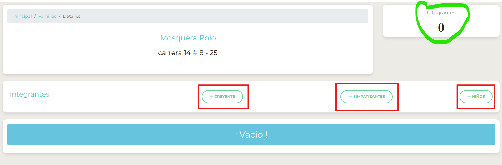 En la siguiente ilustración, se visualizarán en recuadros rojos, los botones que permiten adicionar del listado actual de creyentes, simpatizantes o niños a la familia en edición: