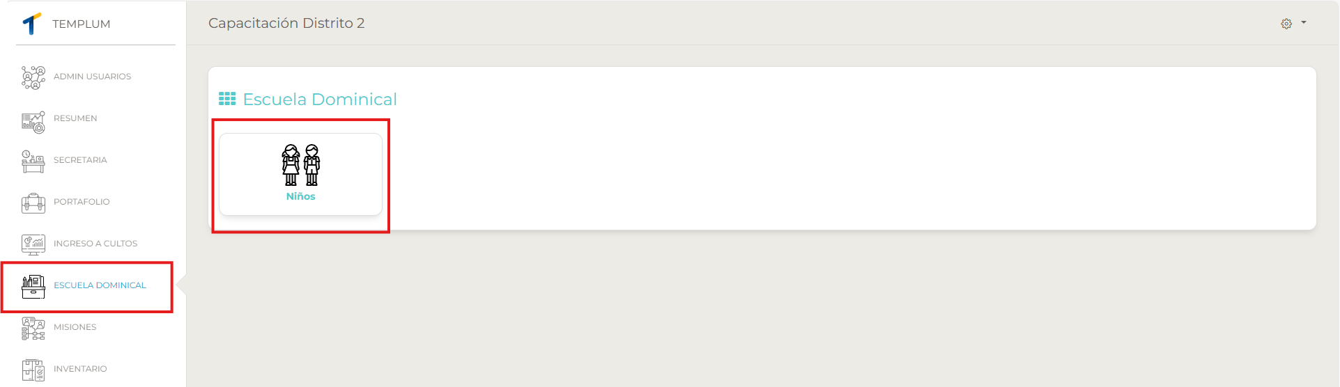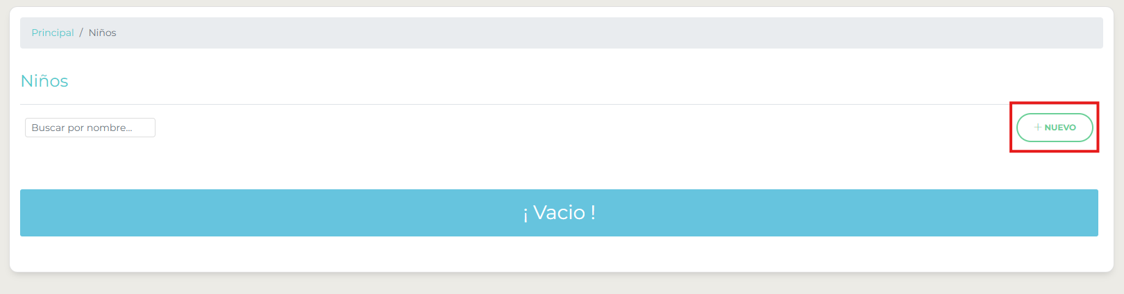 Está opción permite administrar a los niños de la congregación. Una vez se ingresa por la opción niños, se accede al listado de niños, con la opción de adicionar nuevos niños, usando el botón ‘+ Nuevo’ como indica la siguiente ilustración: