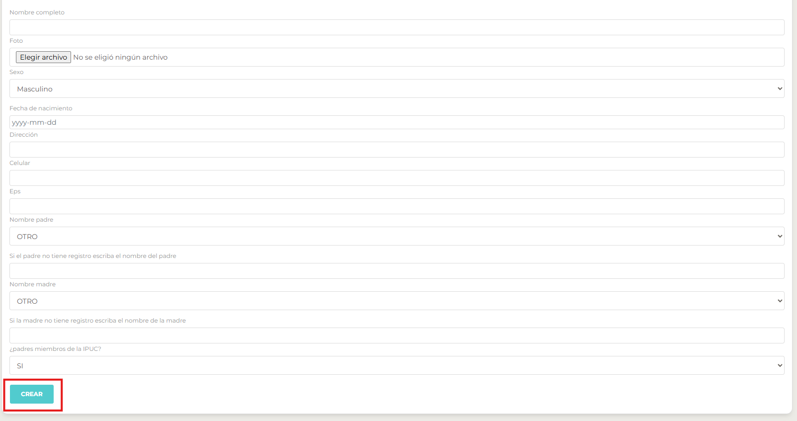 - Diligencie los campos y de click en el botón crear, la siguiente ilustración muestra la vista de creación de niños: